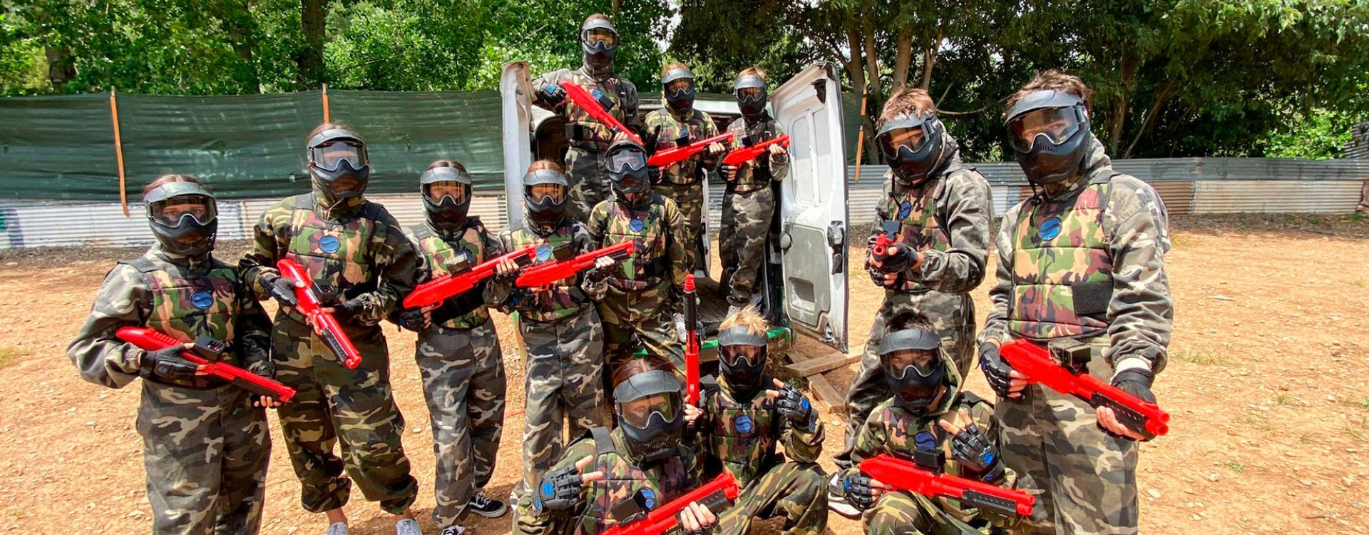 Una divertida de Paintall en nuestro campo de entrenamiento, con marcadoras adaptadas de muelles. Dos equipos se enfrentan por defender su territorio, participando en distintos juegos de asalto y estrategia. Totalmente equipados con mascaras, protectores y monos de asalto, los participantes ponen a tope su adrenalina, luchando por su objetivo.